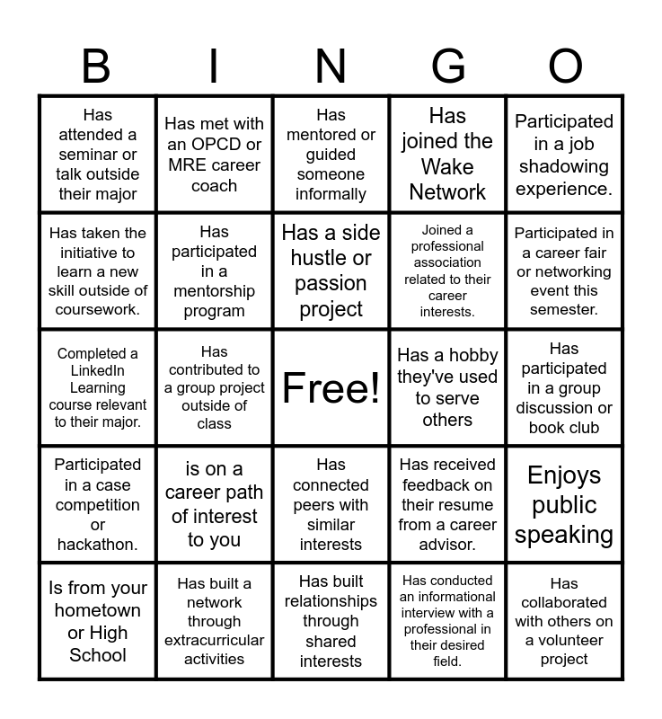 This bingo card has a free space and 29 words: Is from your hometown or High School, Has initiated a conversation with a stranger that led to a meaningful connection, Has contributed to a group project outside of class, Has used social media to join or create a community group, Has attended a seminar or talk outside their major, Has mentored or guided someone informally, Has participated in a mentorship program, is on a career path of interest to you, Has a hobby they've used to serve others, Has built a network through extracurricular activities, Has participated in a group discussion or book club, Has collaborated with others on a volunteer project, Has built relationships through shared interests, Has conducted an informational interview with a professional in their desired field., Participated in a career fair or networking event this semester., Is actively seeking internship opportunities for the upcoming semester., Has connected peers with similar interests, Participated in a case competition or hackathon., Participated in a job shadowing experience., Completed a LinkedIn Learning course relevant to their major., Has received feedback on their resume from a career advisor., Attended a seminar or webinar on industry trends., Joined a professional association related to their career interests., Has taken the initiative to learn a new skill outside of coursework., Has joined the Wake Network, Has met with an OPCD or MRE career coach, Enjoys public speaking, Has a side hustle or passion project and Has a favorite motivational book or podcast.