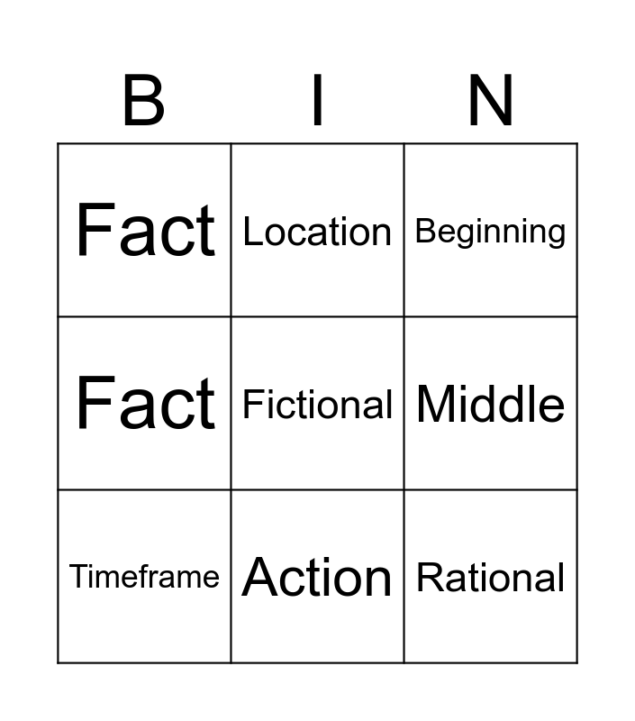This bingo card has a free space and 11 words: Fact, Action, Rational, Timeframe, Location, Beginning, Middle, End, Fact, Fact and Fact.
