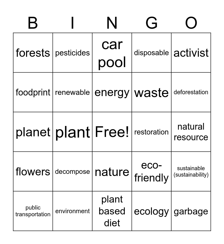 This bingo card has a free space and 103 words: acid rain, action, activist, air, animals, April (22nd), atmosphere, batteries, bees, bicycle, biodegradable, biodiversity, buy local, carbon dioxide (CO2), carbon emission, carbon footprint, car pool, chemicals, clean, cleanup, climate, coal, collective action, compost, conservation, decompose, deforestation, disposable, Earth, Earth Day, eco-friendly, ecology, ecosystem, education, electricity, electric vehicle, emissions, endangered species, energy, environment, extinction, flowers, food (systems), foodprint, footprint (carbon), forests, fossil fuels, garbage, gardening, global warming, green, greenhouse effect, greenhouse gases, habitat, landfill, litter, methane (a greenhouse gas), microplastics, Mother Earth, nature, natural resource, nonrenewable, ocean, oil, organic, oxygen, ozone (layer), pesticides, planet, plant, plant based diet, plastic, Polar icecap, pollinator, pollution, preservation, protect, public transportation, recycle, recycling bin, reduce, reforestation, renewable, resource, restoration, reusable, rivers, single-use plastics, smog, soil, solar (energy / panel / power), sun, sustainable (sustainability), sustainable fashion, volunteer, walk, waste, water, wildlife, wind energy (or wind power), world, worms and zero emission.