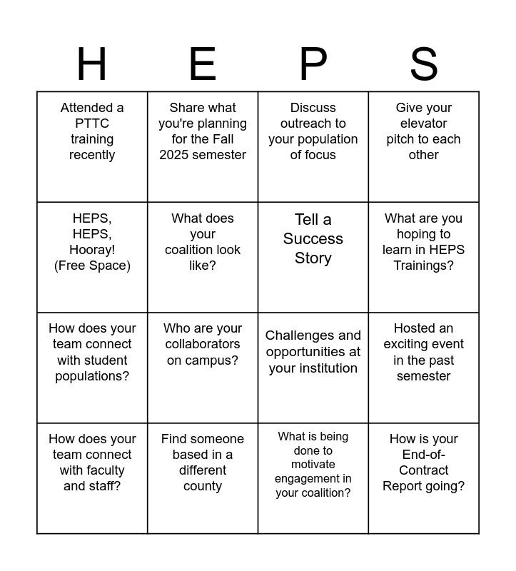 This bingo card has 16 words: Find someone based in a different county, Hosted an exciting event in the past semester, Discuss outreach to your population of focus, Attended a PTTC training recently, How does your team connect with student populations?, Share what you're planning for the Fall 2025 semester, Challenges and opportunities at your institution, What is being done to motivate engagement in your coalition?, HEPS, HEPS, Hooray! (Free Space), What does your coalition look like?, How does your team connect with faculty and staff?, Give your elevator pitch to each other, Who are your collaborators on campus?, What are you hoping to learn in HEPS Trainings?, Tell a Success Story and How is your End-of-Contract Report going?.