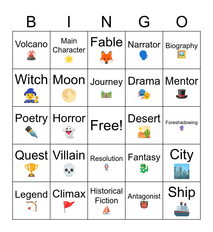 This bingo card has a free space and 52 words: Hero ๐ฆธ, Villain ๐, Protagonist ๐ฆ, Antagonist ๐น, Mentor ๐ฉ, Sidekick ๐ถ, Main Character ๐, Supporting Character ๐ฌ, Narrator ๐ฃ๏ธ, Detective ๐, Witch ๐งโโ๏ธ, Monster ๐พ, Alien ๐ฝ, Fantasy ๐, Mystery ๐ต๏ธ, Science Fiction ๐, Horror ๐ป, Historical Fiction โต, Adventure ๐งญ, Biography ๐ผ๏ธ, Poetry โ๏ธ, Fairy Tale ๐ง, Fable ๐ฆ, Drama ๐ญ, Myth โก, Legend ๐น, Castle ๐ฐ, Forest ๐ฒ, Desert ๐๏ธ, City ๐๏ธ, Island ๐๏ธ, Moon ๐, School ๐ซ, War Zone ๐ช, Ship ๐ข, Volcano ๐, Jungle ๐, Mountain ๐๏ธ, Space ๐, Exposition ๐, Conflict ๐งจ, Climax ๐ฉ, Resolution ๐ชข, Flashback ๐, Foreshadowing ๐ฎ, Plot Twist โ, Suspense ๐ฑ, Journey ๐ค๏ธ, Map ๐บ๏ธ, Time Travel ๐ฐ๏ธ, Quest ๐ and Puzzle ๐งฉ.