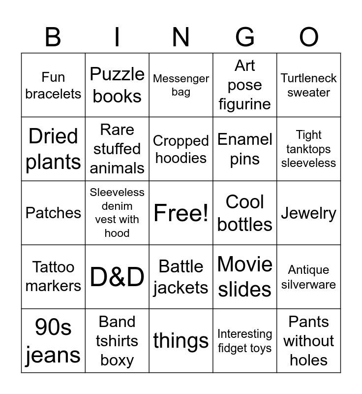 This bingo card has a free space and 25 words: D&D, things, Cropped hoodies, 90s jeans, Turtleneck sweater, Fun bracelets, Dried plants, Puzzle books, Cool bottles, Battle jackets, Enamel pins, Patches, Movie slides, Antique silverware, Rare stuffed animals, Glimmies, Jewelry, Messenger bag, Tight tanktops sleeveless, Sleeveless denim vest with hood, Pants without holes, Band tshirts boxy, Tattoo markers, Art pose figurine and Interesting fidget toys.
