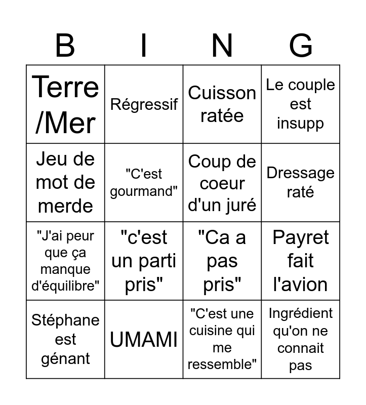 This bingo card has 16 words: UMAMI, Payret fait l'avion, Cuisson ratée, Terre /Mer, "J'ai peur que ça manque d'équilibre", Régressif, "Ca a pas pris", "C'est une cuisine qui me ressemble", Jeu de mot de merde, "C'est gourmand", Stéphane est génant, Le couple est insupp, "c'est un parti pris", Dressage raté, Coup de coeur d'un juré and Ingrédient qu'on ne connait pas.