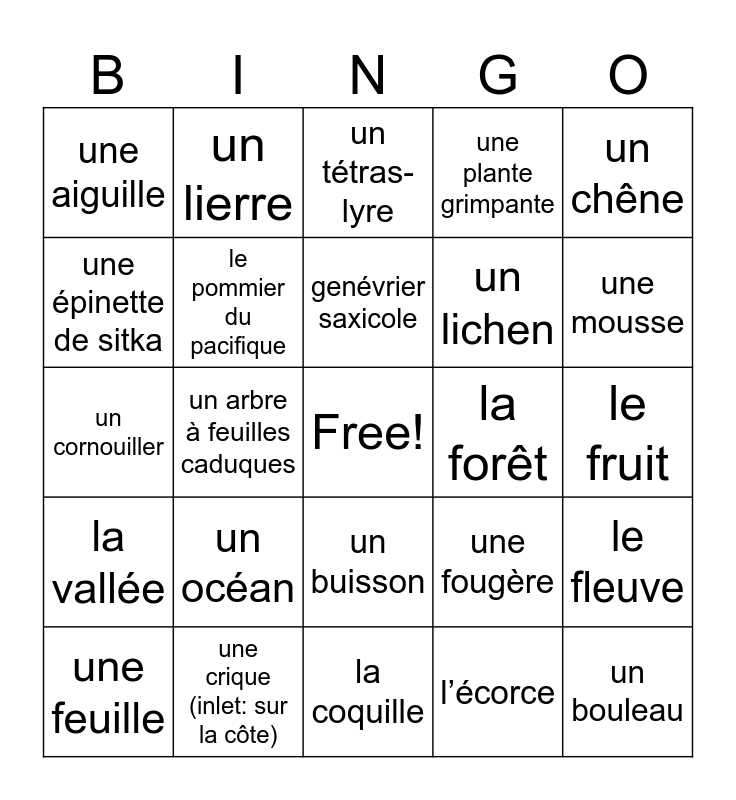 This bingo card has a free space and 75 words: la place de la grouse bleue, un tétras sombre, un tétras-lyre, un arbre, un conifère, un douglas, un sapin de douglas, un pin d'oregon, un genévrier de virginie, un genévrier rouge,, un cèdre rouge, un cèdre jaune, genévrier saxicole, une épinette de sitka, une ciguë, un arbre à feuilles caduques, un arbre à feuillage caduc, un bouleau, un érable, un chêne, un arbousier, un cornouiller, le pommier du pacifique, un lierre, une plante grimpante, une vigne, une plante, une fleur, une mûre (baie), un mûrier (plante), un faux arum, un lysichite jaune, un chou puant, une fougère, une mousse, un lichen, un champignon, le tronc, le fruit, l’écorce, une baie (berry), le houppier, le feuillage, un cône, une racine, un pignon, une feuille, une aiguille, un arbre, une écaille, un arbuste, un buisson, le bourgeon, un marais, un marécage, un étang, une montagne, une colline, les amas de coquilles, la mer, un océan, la baie (bay), la plage, la falaise, la côte, la forêt, la rivière, le lac, le ruisseau, le fleuve, la vallée, une crique (inlet: sur la côte), le bras de mer (inlet: entre les îles), la coquille and le coquillage.