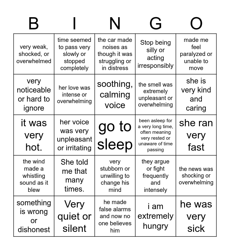 This bingo card has a free space and 24 words: She told me that many times., Very quiet or silent, soothing, calming voice, something is wrong or dishonest, made me feel paralyzed or unable to move, very weak, shocked, or overwhelmed, very noticeable or hard to ignore, time seemed to pass very slowly or stopped completely, been asleep for a very long time, often meaning very rested or unaware of time passing, very stubborn or unwilling to change his mind, the smell was extremely unpleasant or overwhelming, it was very hot., they argue or fight frequently and intensely, the news was shocking or overwhelming, her love was intense or overwhelming, i am extremely hungry, she ran very fast, the car made noises as though it was struggling or in distress, she is very kind and caring, her voice was very unpleasant or irritating, he was very sick, the wind made a whistling sound as it blew, Stop being silly or acting irresponsibly and he made false alarms and now no one believes him.