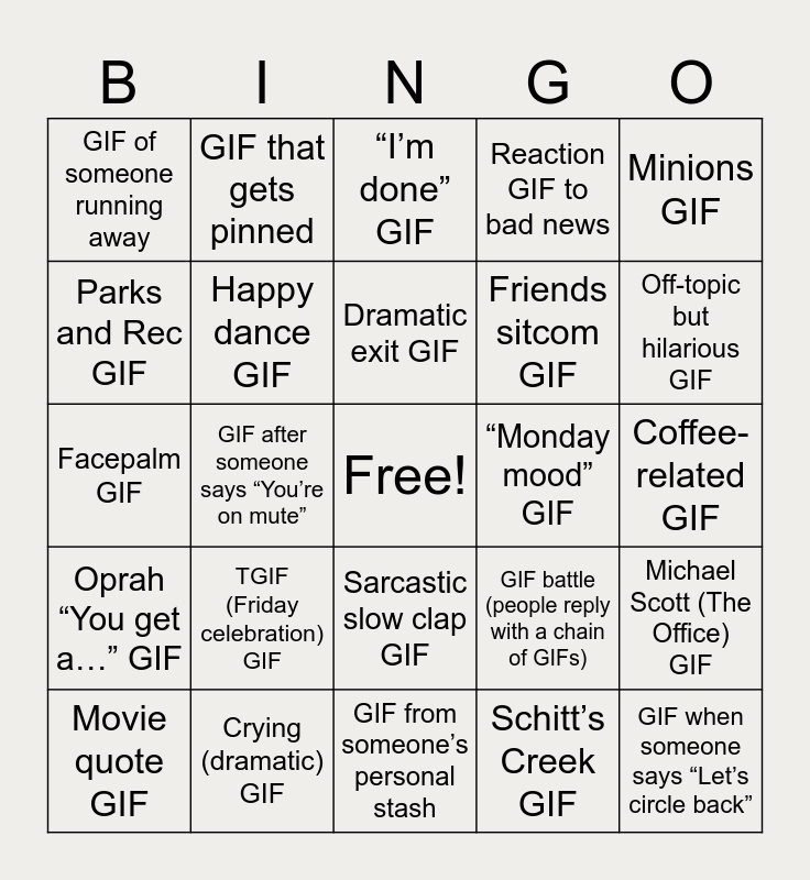 This bingo card has a free space and 40 words: Eye roll GIF, Facepalm GIF, Applause GIF, Happy dance GIF, Crying (dramatic) GIF, Sarcastic slow clap GIF, Dramatic exit GIF, Surprise Pikachu face GIF, Minions GIF, Oprah “You get a…” GIF, GIF after someone says “You’re on mute”, Reaction GIF to bad news, GIF when someone says “Let’s circle back”, Coffee-related GIF, “Monday mood” GIF, TGIF (Friday celebration) GIF, "Me waiting…" GIF, GIF of someone running away, Office meltdown GIF, “I’m done” GIF, Michael Scott (The Office) GIF, Schitt’s Creek GIF, Friends sitcom GIF, Parks and Rec GIF, Spongebob GIF, Baby Yoda / Grogu GIF, “It’s happening!” GIF, “NOPE” GIF, Cat GIF, Dance party GIF, Custom meme GIF, Movie quote GIF, Animated text GIF, GIF battle (people reply with a chain of GIFs), Off-topic but hilarious GIF, GIF from someone’s personal stash, Perfectly timed GIF, Overused but still funny GIF, GIF that gets pinned and “Best ever” GIF moment.