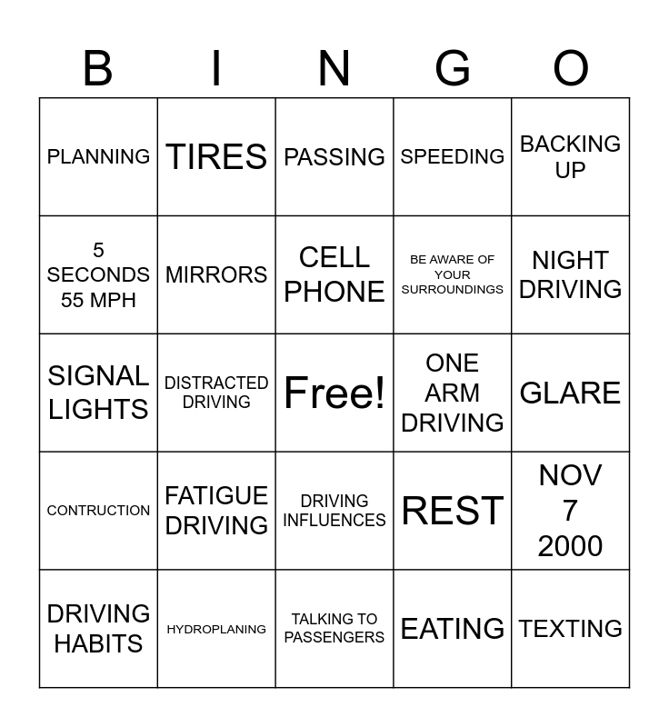 This bingo card has a free space and 49 words: AGRESSIVE DRIVING, TEXTING, ROAD RAGE, TALKING TO PASSENGERS, FATIGUE DRIVING, FOLLOWING DISTANCE, TIRES, WEATHER, 5 SECONDS 55 MPH, IMPAIRED DRIVING, MIRRORS, SPEEDING, NOV 7 2000, REST, SEAT BELT, BLIND SPOT, CELL PHONE, ONE ARM DRIVING, 3 SECOND RULE, BACKING UP, DISTRACTED DRIVING, EATING, PLANNING, BE AWARE OF YOUR SURROUNDINGS, PASSING, NIGHT DRIVING, DRIVING HABITS, MAINTENANCE, DRIVING INFLUENCES, CONTRUCTION, YOUNG DRIVERS, DETOURS, ELDERLY DRIVERS, REST STOPS, HYDROPLANING, WINDOWS CLEAN, WIPERS, SCAN MIRRORS, GLARE, LOW BEAMS, DRUNK DRIVING, DIRTY HEADLIGHTS, LEAVING KEYS IN VEHICLE, IDLING, SIGNAL LIGHTS, PASSING, ROLLING STOP, CAUTION and COMMON SENSE.