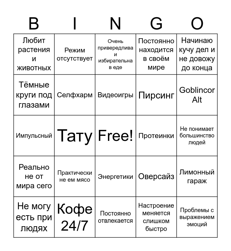 This bingo card has a free space and 24 words: Практически не ем мясо, Кофе 24/7, Видеоигры, Не могу есть при людях, Начинаю кучу дел и не довожу до конца, Любит растения и животных, Тёмные круги под глазами, Режим отсутствует, Протеинки, Энергетики, Пирсинг, Импульсный, Оверсайз, Лимонный гараж, Селфхарм, Настроение меняется слишком быстро, Не понимает большинство людей, Очень привередлива и избирательна в еде, Goblincor Alt, Тату, Проблемы с выражением эмоций, Реально не от мира сего, Постоянно находится в своём мире and Постоянно отвлекается.