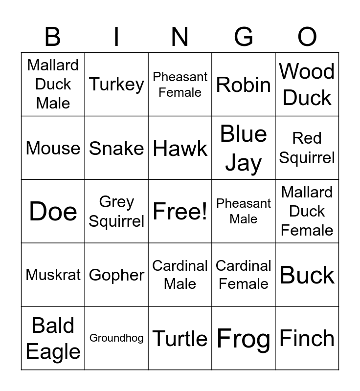 This bingo card has a free space and 24 words: Gopher, Groundhog, Hawk, Bald Eagle, Wood Duck, Mallard Duck Male, Mouse, Turkey, Pheasant Male, Cardinal Male, Blue Jay, Doe, Cardinal Female, Buck, Snake, Frog, Mallard Duck Female, Pheasant Female, Red Squirrel, Grey Squirrel, Finch, Muskrat, Robin and Turtle.
