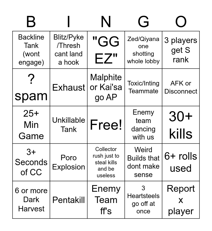 This bingo card has a free space and 24 words: Poro Explosion, Pentakill, Malphite or Kai'sa go AP, 6 or more Dark Harvest, 3 players get S rank, Backline Tank (wont engage), ? spam, Blitz/Pyke /Thresh cant land a hook, Enemy team dancing with us, Collector rush just to steal kills and be useless, Toxic/Inting Teammate, 25+ Min Game, Weird Builds that dont make sense, 6+ rolls used, Exhaust, 3 Heartsteels go off at once, 30+ kills, "GG EZ", AFK or Disconnect, Unkillable Tank, Report x player, 3+ Seconds of CC, Zed/Qiyana one shotting whole lobby and Enemy Team ff's.