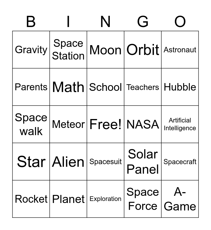 This bingo card has a free space and 43 words: Steve wears something silly, A-Game, Avengers, Rocket, Satellite, Space Force, Moon, Mars, Astronaut, Planet, Orbit, NASA, Spacesuit, Alien, Booster, Exploration, Rover, Space walk, Engineer, Hubble, Space Station, Propulsion, Mission, Gravity, GPS, Artificial Intelligence, Debris, Antenna, Solar Panel, Star, Scientist, Spacecraft, Solar System, Meteor, Apollo, Artemis, Rocket Fuel, School, Parents, Teachers, Science, Math and Technology.