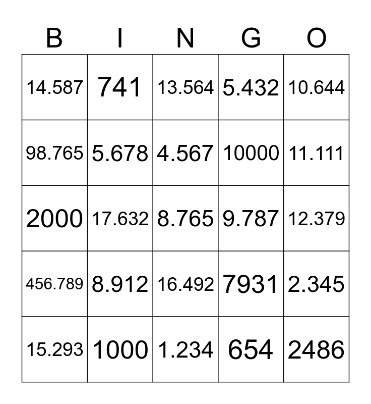 This bingo card has 37 words: 7.891, 18.964, 9.876, 5.678, 2.345, 8.912, 4.567, 6.789, 10.644, 3.210, 17.632, 5.432, 8.765, 12.379, 98.765, 456.789, 75.300, 13.564, 16.492, 9.787, 14.587, 11.111, 15.293, 1.234, 3.123, 654, 741, 789, 852, 963, 987, 1000, 2000, 2486, 7931, 10000 and 1000000.