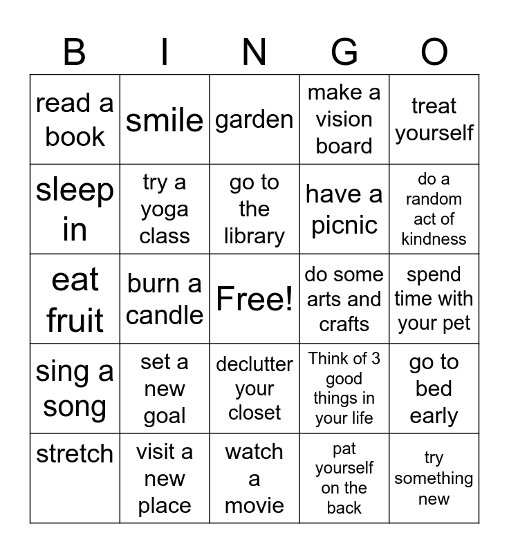 This bingo card has a free space and 25 words: stretch, set a new goal, go to the library, pat yourself on the back, do a random act of kindness, read a book, smile, garden, have a picnic, go to bed early, eat fruit, try a yoga class, Think of 3 good things in your life, try something new, sleep in, visit a new place, watch a movie, make a vision board, spend time with your pet, sing a song, burn a candle, declutter your closet, do some arts and crafts, treat yourself and This bingo card has a free space add 75 numbers: 1, 16, 31, 46, 61, 2, 17, 32, 47, 62, 3, 18, 48, 63, 4, 19, 33, 49, 64, 5, 20, 34, 50, 65, 6, 21, 35, 51, 66, 7, 22, 36, 52, 67, 8, 23, 37, 53, 68, 9, 24, 38, 54, 69, 10, 25, 39, 55, 70, 11, 26, 40,.