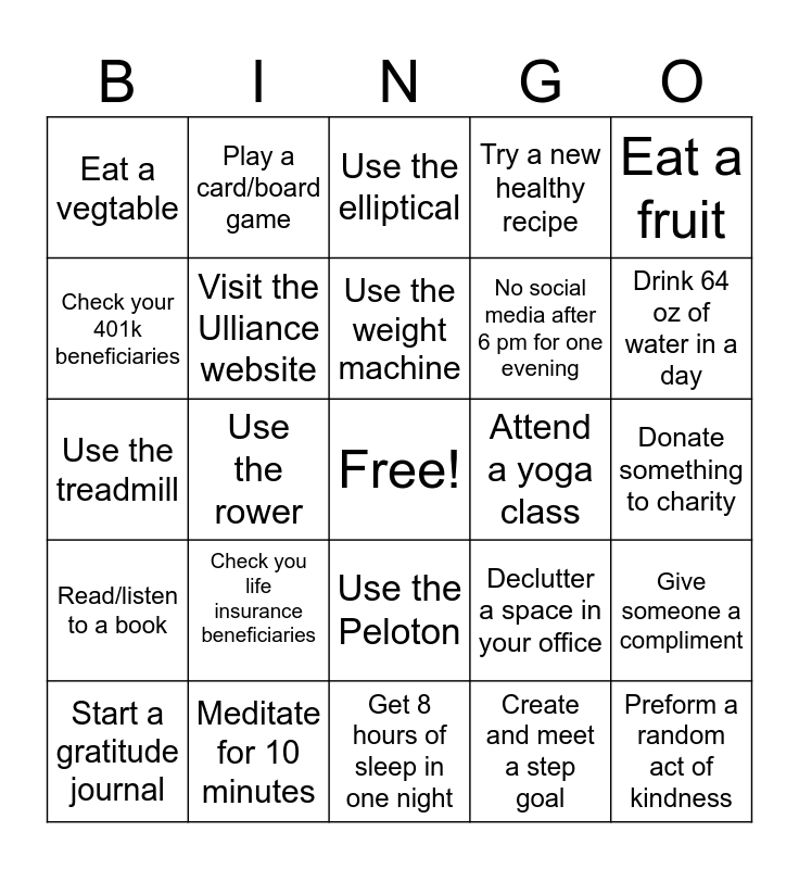 This bingo card has a free space and 24 words: Check you life insurance beneficiaries, Meditate for 10 minutes, Use the weight machine, Start a gratitude journal, Eat a fruit, Eat a vegtable, Check your 401k beneficiaries, Play a card/board game, Attend a yoga class, Use the Peloton, No social media after 6 pm for one evening, Use the treadmill, Declutter a space in your office, Give someone a compliment, Visit the Ulliance website, Create and meet a step goal, Donate something to charity, Use the elliptical, Drink 64 oz of water in a day, Use the rower, Preform a random act of kindness, Read/listen to a book, Try a new healthy recipe and Get 8 hours of sleep in one night.