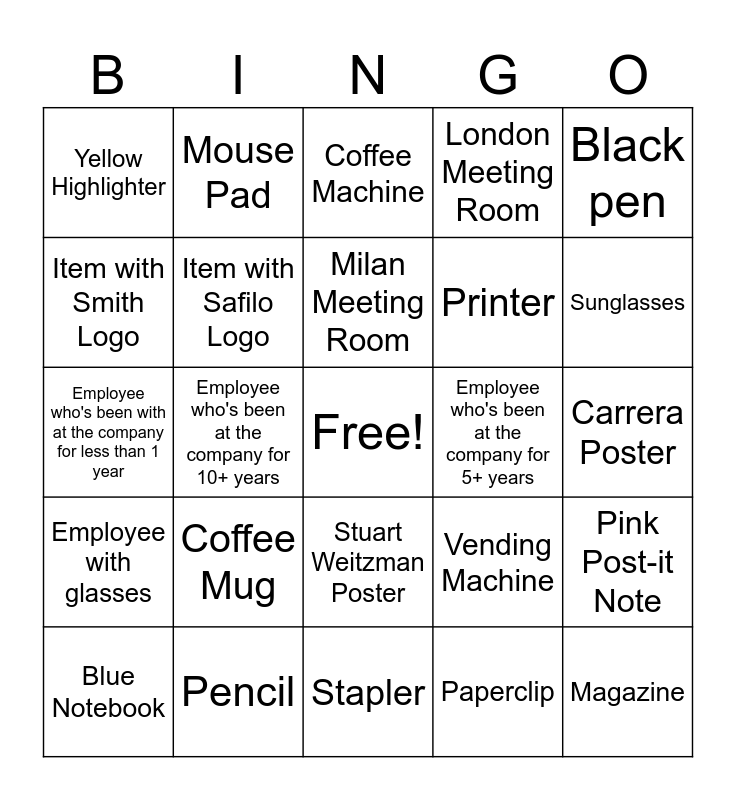 This bingo card has a free space and 24 words: Coffee Mug, Pencil, Milan Meeting Room, Blue Notebook, Black pen, Yellow Highlighter, Item with Smith Logo, Mouse Pad, Employee who's been at the company for 5+ years, Stuart Weitzman Poster, Printer, Employee who's been with at the company for less than 1 year, Vending Machine, Pink Post-it Note, Item with Safilo Logo, Paperclip, Carrera Poster, Coffee Machine, Sunglasses, Employee who's been at the company for 10+ years, Magazine, Employee with glasses, London Meeting Room and Stapler.