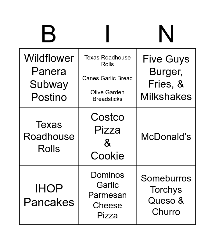 This bingo card has 12 words: Culver’s Chick-fil-a, Someburros Torchys Queso & Churro, Costco Pizza & Cookie, McDonald’s, Texas Roadhouse Rolls Canes Garlic Bread Olive Garden Breadsticks, Five Guys Burger, Fries, & Milkshakes, Dominos Garlic Parmesan Cheese Pizza, Oreganos cheesy garlic bread & Pizookie, Wildflower Panera Subway Postino, Texas Roadhouse Rolls, IHOP Pancakes and Regular dominos.