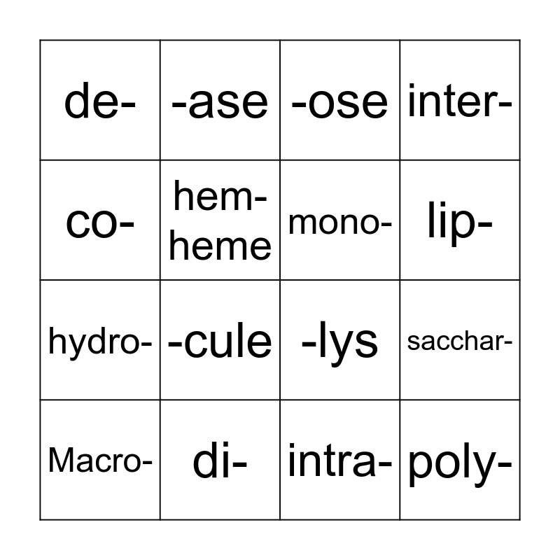 This bingo card has 18 words: -cule, poly-, -ose, de-, -lys, inter-, Macro-, -ase, lip-, hydro-, intra-, co-, sacchar-, hem-heme, mono-, -mer, di- and un-.