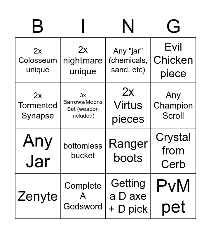 This bingo card has 25 words: Blood Shard (PVM), Basilisk Jaw, Any Champion Scroll, 2x Raid Purples, 2x Tormented Synapse, 2x Colosseum unique, 3x Barrows/Moons Set (weapon included), 2x nightmare unique, Complete A Godsword, Greenlog Huey, Any Jar, Ranger boots, Any Skilling Pet, Enhanced Crystal Weapon Seed, 2x Virtus pieces, Complete A Voidwaker, Getting a D axe + D pick, Any "jar" (chemicals, sand, etc), bottomless bucket, Crystal from Cerb, Zenyte, Spirit seed, PvM pet, Evil Chicken piece and Rangers.
