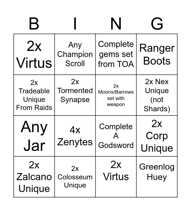 This bingo card has 22 words: 2x Colosseum Unique, 2x Nightmare Unique, Any Champion Scroll, 2x Nightmare Unique, 2x Tormented Synapse, 2x Moons/Barrows set with weapon, 2x Virtus, Complete gems set from TOA, Complete A Godsword, Greenlog Huey, Any Jar, Ranger Boots, Any Skilling Pet, Enhanced Crystal Weapon seed, 2x Virtus, Complete Voidwaker, 2x Corp Unique, 2x Zalcano Unique, 4x Zenytes, 2x Tradeable Unique From Raids, 2x Nex Unique (not Shards) and 2x Hydra Claw.