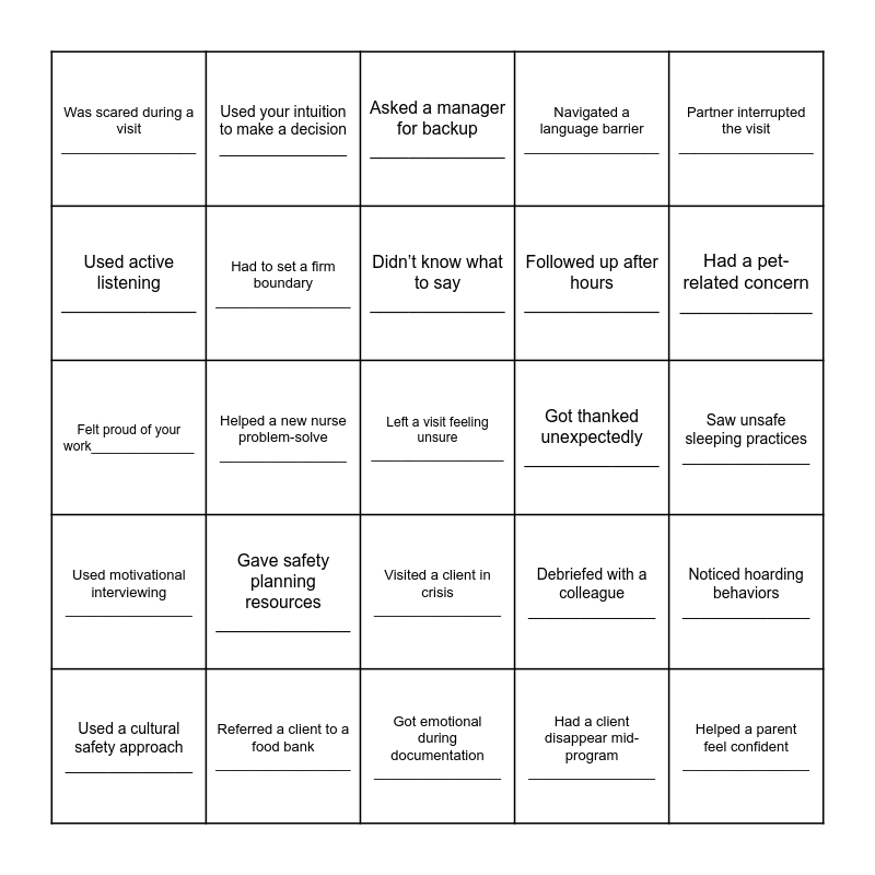 This bingo card has 25 words: Used motivational interviewing ________________, Referred a client to a food bank _________________, Left a visit feeling unsure __________________, Had a client disappear mid-program ________________, Partner interrupted the visit _________________, Was scared during a visit _________________, Used your intuition to make a decision _______________, Asked a manager for backup ______________, Got thanked unexpectedly ______________, Noticed hoarding behaviors _______________, Used active listening ______________, Had to set a firm boundary _________________, Got emotional during documentation ________________, Debriefed with a colleague _______________, Had a pet-related concern _____________, Used a cultural safety approach _______________, Helped a new nurse problem-solve ________________, Didn’t know what to say ______________, Followed up after hours ______________, Saw unsafe sleeping practices _______________, Felt proud of your work______________, Gave safety planning resources ______________, Visited a client in crisis ________________, Navigated a language barrier _________________ and Helped a parent feel confident ________________.