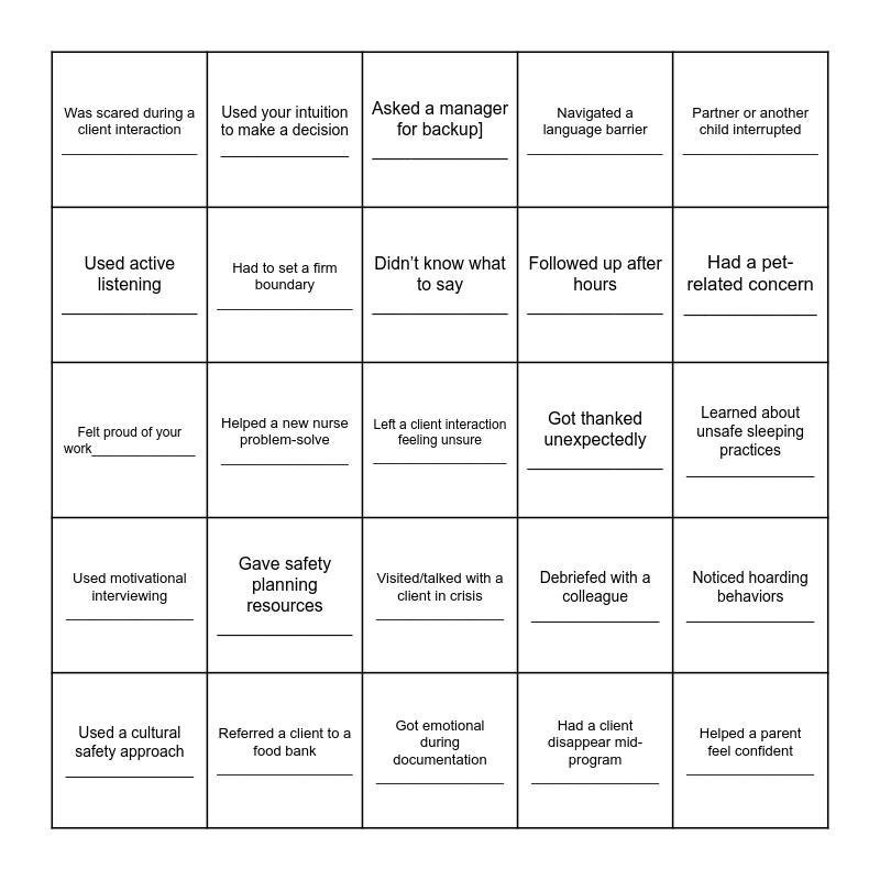 This bingo card has 25 words: Used motivational interviewing ________________, Referred a client to a food bank _________________, Left a client interaction feeling unsure __________________, Had a client disappear mid-program ________________, Partner or another child interrupted _________________, Was scared during a client interaction _________________, Used your intuition to make a decision _______________, Asked a manager for backup] ______________, Got thanked unexpectedly ______________, Noticed hoarding behaviors _______________, Used active listening ______________, Had to set a firm boundary _________________, Got emotional during documentation ________________, Debriefed with a colleague _______________, Had a pet-related concern _____________, Used a cultural safety approach _______________, Helped a new nurse problem-solve ________________, Didn’t know what to say ______________, Followed up after hours ______________, Learned about unsafe sleeping practices _______________, Felt proud of your work______________, Gave safety planning resources ______________, Visited/talked with a client in crisis ________________, Navigated a language barrier _________________ and Helped a parent feel confident ________________.