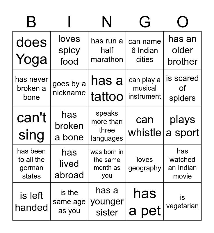 This bingo card has 25 words: has lived abroad, has a younger sister, has a tattoo, is left handed, has an older brother, does Yoga, has never broken a bone, loves spicy food, can whistle, was born in the same month as you, can play a musical instrument, can't sing, loves geography, has watched an Indian movie, goes by a nickname, is vegetarian, plays a sport, has run a half marathon, is scared of spiders, has broken a bone, speaks more than three languages, is the same age as you, has been to all the german states, can name 6 Indian cities and has a pet.