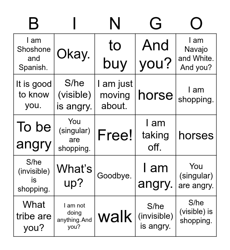 This bingo card has a free space and 24 words: What’s up?, I am not doing anything. And you?, I am just moving about., What tribe are you?, I am Navajo and White. And you?, I am Shoshone and Spanish., It is good to know you., Okay., I am taking off., Goodbye., horse, To be angry, I am angry., You (singular) are angry., S/he (visible) is angry., S/he (invisible) is angry., horses, to buy, I am shopping., You (singular) are shopping., S/he (visible) is shopping., S/he (invisible) is shopping., And you? and walk.