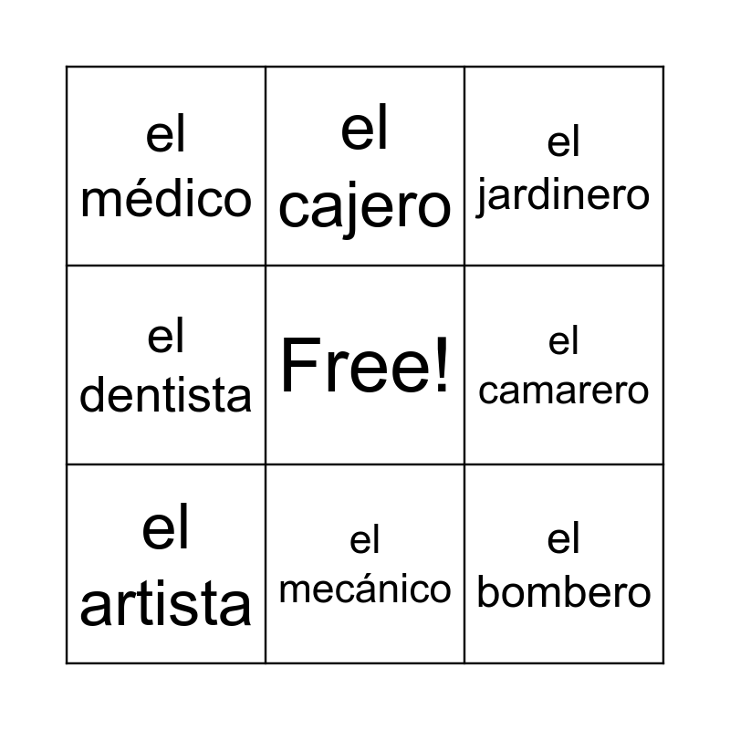 This bingo card has a free space and 12 words: el cocinero, la policía, el bombero, el camarero, el cajero, el jardinero, el mecánico, el trabajo, el médico, el dentista, el artista and el músico.