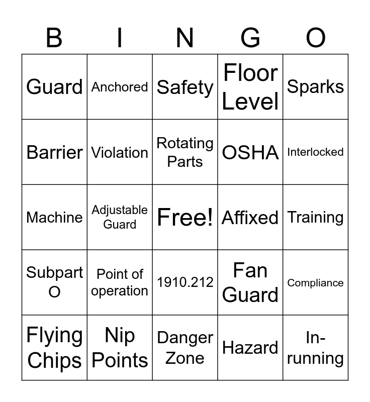 This bingo card has a free space and 24 words: Point of operation, Nip Points, Rotating Parts, Flying Chips, Sparks, Guard, Barrier, Anchored, Affixed, 1910.212, OSHA, Machine, Fan Guard, Compliance, Violation, Hazard, Training, Safety, Interlocked, Adjustable Guard, In-running, Subpart O, Floor Level and Danger Zone.