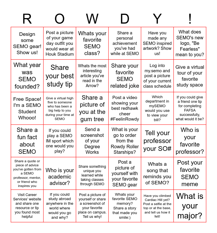 This bingo card has 36 words: Post a picture of yourself with your favorite SEMO gear, Share something unique you learned while taking classes through SEMO, Whats your favorite SEMO memory? Share a story that made you smile:), What year was SEMO founded?, Share a fun fact about SEMO, Post a video showing your best redhawk cheer #FeelinRowdy, Share your best study tip, Post a picture of yourself or share a screenshot of your favorite place on campus. Tell us why!, Have you made any SEMO inspired artwork? Show us!, Whats a song that reminds you of SEMO?, Give a virtual tour of your favorite study space, Share a personal achievement you've had while at SEMO, Post your favorite SEMO meme, Give a virtual high five to someone who has been a big help to you during your time at SEMO, Share your favorite SEMO related joke, Design some SEMO gear! Show us!, Share a quote or piece of advice you've gotten from a SEMO professor, mentor, or friend who inspires you, Which department in mySEMO would you use to view your bill?, Free Space! I'm a SEMO Student Whooo!, Whats your favorite SEMO class?, Share a picture of you at the gum tree, If you could play a SEMO IM sport which one would you play?, What is your go to order from the Rowdy Roller Starships?, Send a screenshot of your Degree Works, Tell your professor your SO#, Post a picture of your game day outfit you would wear at Houk Stadium, Log into my.semo and post a picture of your current class schedule, If you could study abroad anywhere in the world where would you go and why?, Whats the most interesting article you've read in the Arrow?, What does SEMO's new logo, "Be Fearless" mean to you?, What is your major?, Visit Career Services’ website and share one resource or tip you found most helpful, Who is your favorite professor?, If you could give a friend one tip for completing FAFSA successfully, what would it be?, Who is your academic advisor? and Have you climbed Cardiac Hill yet? Post a selfie at the top or at the base, and tell us how it felt!.