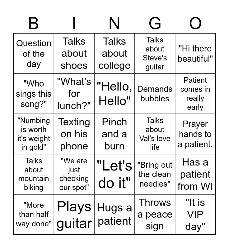 This bingo card has a free space and 24 words: "We are just checking our spot", Plays guitar, "Hello, Hello", "More than half way done", "Hi there beautiful", Question of the day, "Who sings this song?", Talks about shoes, Talks about Val's love life, "Let's do it", Demands bubbles, "Numbing is worth it's weight in gold", "Bring out the clean needles", Has a patient from WI, "What's for lunch?", Throws a peace sign, Prayer hands to a patient., Talks about college, Patient comes in really early, Texting on his phone, "It is VIP day", Talks about mountain biking, Talks about Steve's guitar and Hugs a patient.