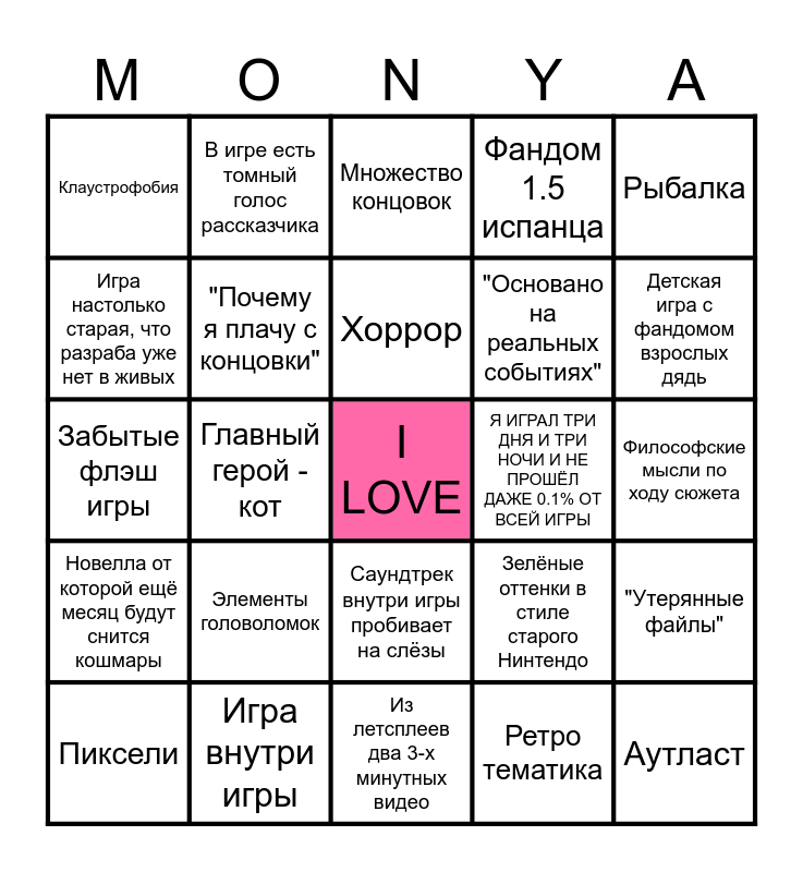 This bingo card has a free space and 24 words: Пиксели, Элементы головоломок, Хоррор, Ретро тематика, Рыбалка, Клаустрофобия, В игре есть томный голос рассказчика, Множество концовок, Я ИГРАЛ ТРИ ДНЯ И ТРИ НОЧИ И НЕ ПРОШЁЛ ДАЖЕ 0.1% ОТ ВСЕЙ ИГРЫ, Философские мысли по ходу сюжета, Забытые флэш игры, "Почему я плачу с концовки", Зелёные оттенки в стиле старого Нинтендо, "Утерянные файлы", Игра настолько старая, что разраба уже нет в живых, Игра внутри игры, Из летсплеев два 3-х минутных видео, Фандом 1.5 испанца, Детская игра с фандомом взрослых дядь, Новелла от которой ещё месяц будут снится кошмары, Главный герой - кот, Саундтрек внутри игры пробивает на слёзы, "Основано на реальных событиях" and Аутласт.
