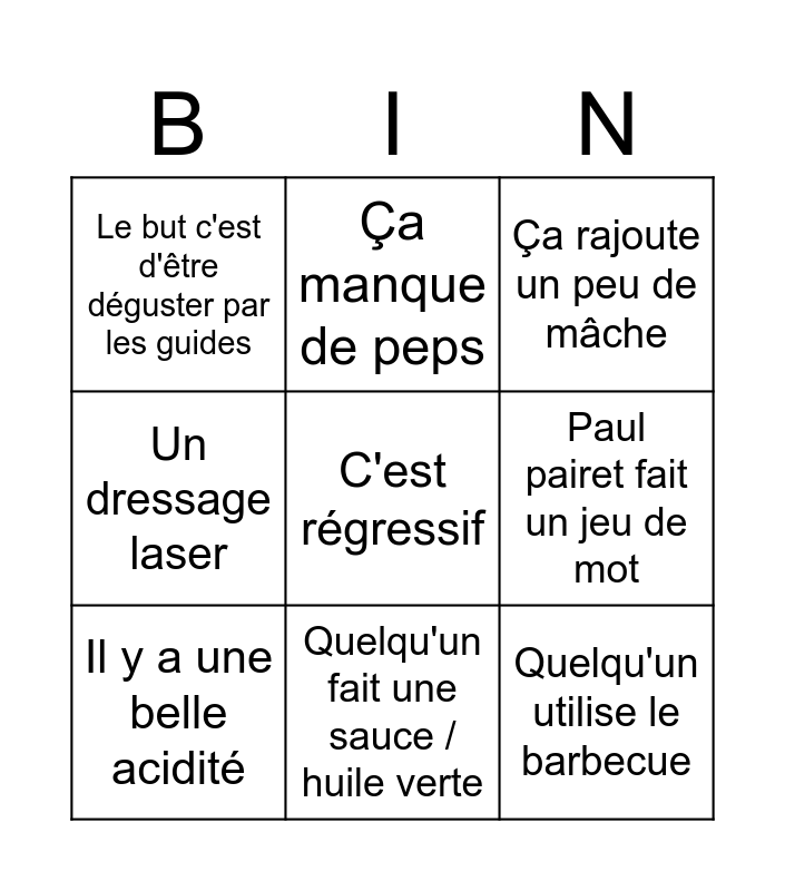 This bingo card has a free space and 8 words: Paul pairet fait un jeu de mot, Ça rajoute un peu de mâche, Ça manque de peps, Il y a une belle acidité, Le but c'est d'être déguster par les guides, Quelqu'un utilise le barbecue, Un dressage laser and Quelqu'un fait une sauce / huile verte.