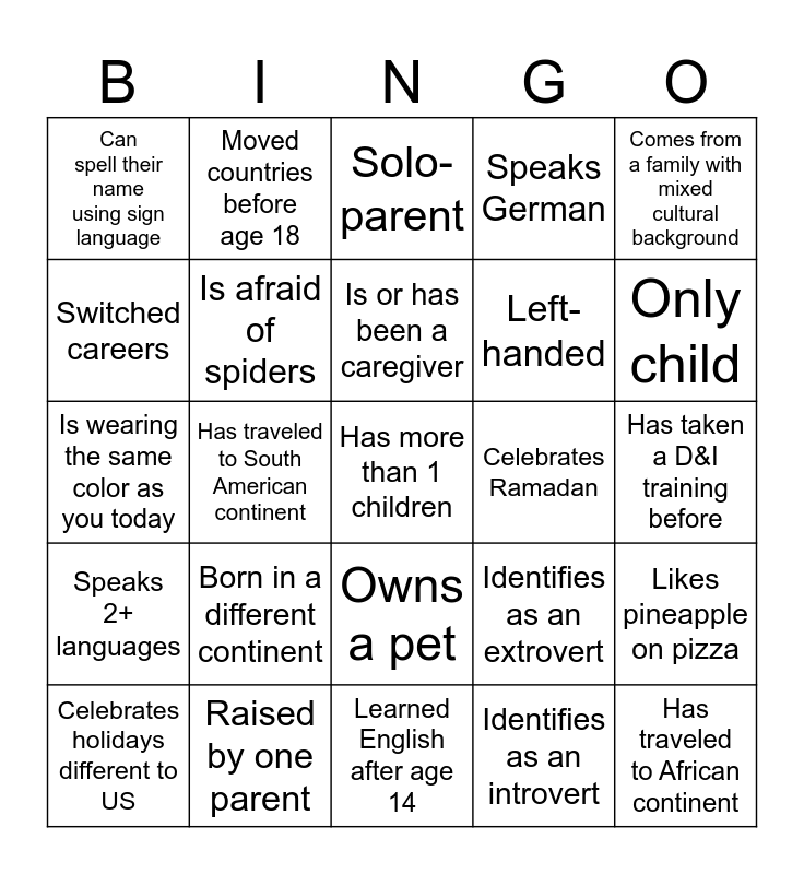 This bingo card has a free space and 24 words: Born in a different continent, Raised by one parent, Is or has been a caregiver, Celebrates holidays different to US, Comes from a family with mixed cultural background, Can spell their name using sign language, Switched careers, Moved countries before age 18, Celebrates Ramadan, Owns a pet, Left-handed, Is wearing the same color as you today, Identifies as an extrovert, Likes pineapple on pizza, Is afraid of spiders, Identifies as an introvert, Has taken a D&I training before, Solo-parent, Only child, Has traveled to South American continent, Has traveled to African continent, Speaks 2+ languages, Speaks German and Learned English after age 14.