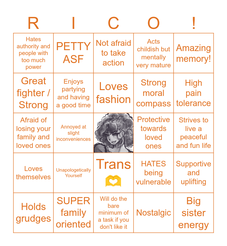 This bingo card has a free space and 24 words: Unapologetically Yourself, SUPER family oriented, Loves fashion, Holds grudges, Amazing memory!, Hates authority and people with too much power, Great fighter / Strong, PETTY ASF, Protective towards loved ones, Trans🫶, Strong moral compass, Afraid of losing your family and loved ones, HATES being vulnerable, Supportive and uplifting, Enjoys partying and having a good time, Nostalgic, Strives to live a peaceful and fun life, Not afraid to take action, High pain tolerance, Annoyed at slight inconveniences, Big sister energy, Loves themselves, Acts childish but mentally very mature and Will do the bare minimum of a task if you don't like it.