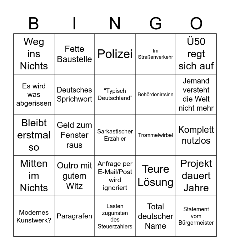 This bingo card has a free space and 24 words: Outro mit gutem Witz, Paragrafen, "Typisch Deutschland", Modernes Kunstwerk?, Ü50 regt sich auf, Weg ins Nichts, Es wird was abgerissen, Fette Baustelle, Trommelwirbel, Anfrage per E-Mail/Post wird ignoriert, Behördenirrsinn, Bleibt erstmal so, Teure Lösung, Projekt dauert Jahre, Deutsches Sprichwort, Total deutscher Name, Komplett nutzlos, Polizei, Jemand versteht die Welt nicht mehr, Geld zum Fenster raus, Statement vom Bürgermeister, Mitten im Nichts, Im Straßenverkehr and Lasten zugunsten des Steuerzahlers.
