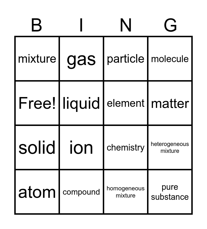 This bingo card has 16 words: compound, heterogeneous mixture, particle, mixture, solid, gas, chemistry, homogeneous mixture, Free!, liquid, atom, molecule, ion, matter, element and pure substance.