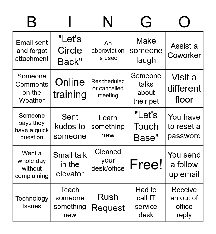 This bingo card has 25 words: Small talk in the elevator, Rush Request, Rescheduled or cancelled meeting, Technology Issues, Assist a Coworker, Email sent and forgot attachment, Someone Comments on the Weather, "Let's Circle Back", "Let's Touch Base", Cleaned your desk/office, Someone talks about their pet, Someone says they have a quick question, Free!, You send a follow up email, Online training, Receive an out of office reply, You have to reset a password, An abbreviation is used, Visit a different floor, Sent kudos to someone, Learn something new, Teach someone something new, Went a whole day without complaining, Make someone laugh and Had to call IT service desk.