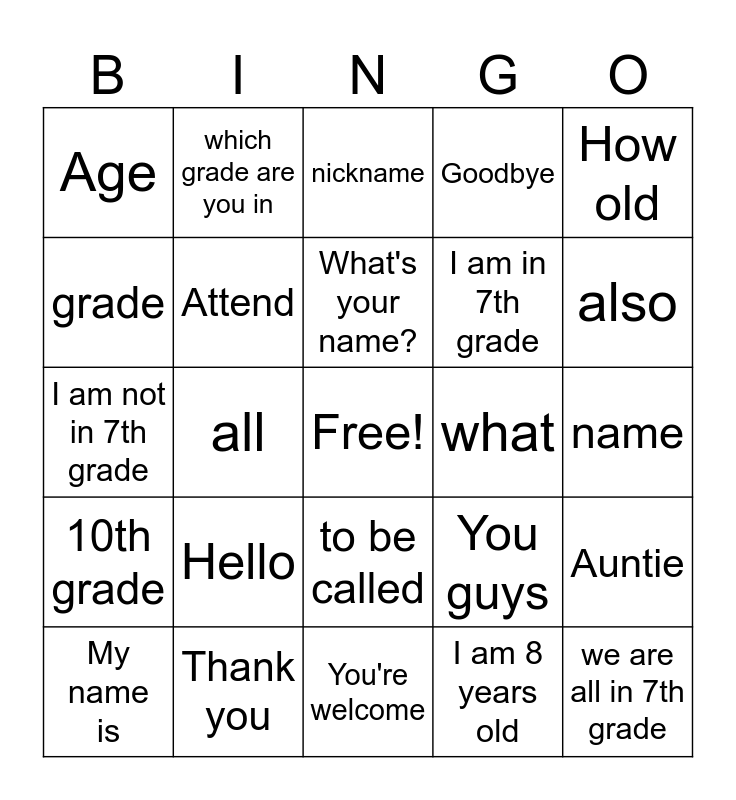 This bingo card has a free space and 24 words: Hello, Thank you, What's your name?, My name is, How old, Age, grade, which grade are you in, what, to be called, I am in 7th grade, I am not in 7th grade, You guys, Auntie, Attend, I am 8 years old, name, nickname, also, all, we are all in 7th grade, 10th grade, Goodbye and You're welcome.