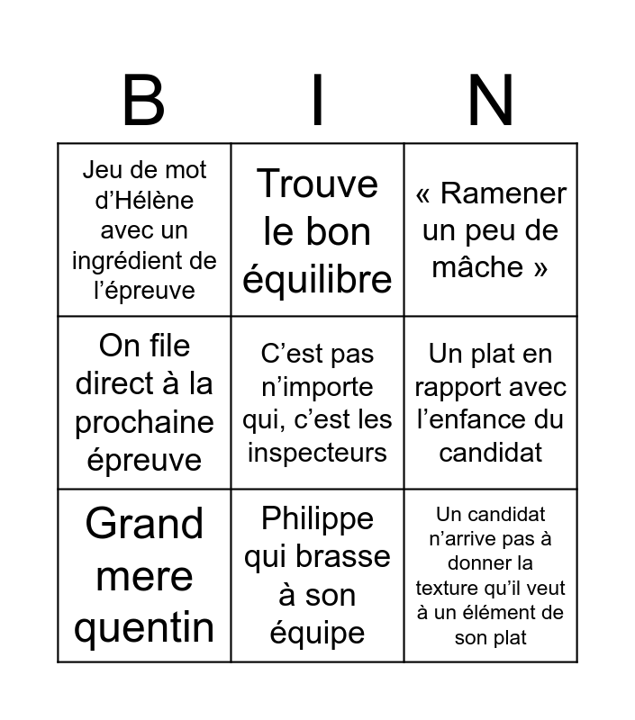 This bingo card has a free space and 8 words: Un plat en rapport avec l’enfance du candidat, « Ramener un peu de mâche », Trouve le bon équilibre, Grand mere quentin, Jeu de mot d’Hélène avec un ingrédient de l’épreuve, Un candidat n’arrive pas à donner la texture qu’il veut à un élément de son plat, On file direct à la prochaine épreuve and Philippe qui brasse à son équipe.