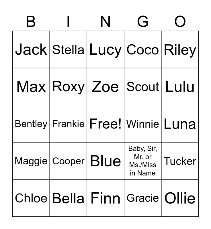 This bingo card has a free space and 24 words: Cooper, Bella, Zoe, Chloe, Riley, Jack, Max, Stella, Winnie, Blue, Scout, Bentley, Baby, Sir, Mr. or Ms./Miss in Name, Tucker, Roxy, Gracie, Luna, Lucy, Lulu, Frankie, Ollie, Maggie, Coco and Finn.