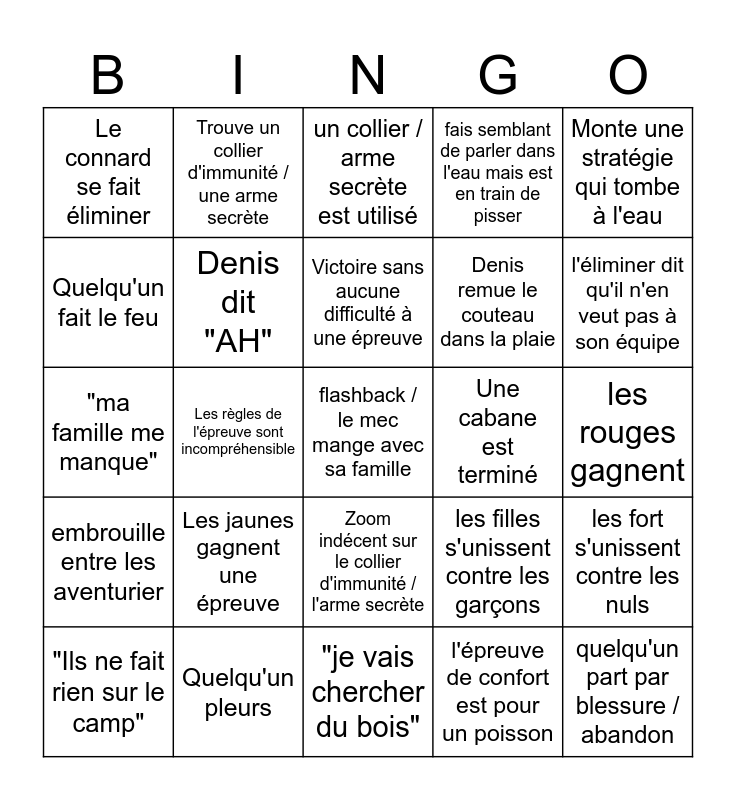 This bingo card has a free space and 24 words: Les jaunes gagnent une épreuve, Quelqu'un pleurs, Victoire sans aucune difficulté à une épreuve, "Ils ne fait rien sur le camp", Monte une stratégie qui tombe à l'eau, Le connard se fait éliminer, Quelqu'un fait le feu, Trouve un collier d'immunité / une arme secrète, Une cabane est terminé, Zoom indécent sur le collier d'immunité / l'arme secrète, Denis remue le couteau dans la plaie, "ma famille me manque", les filles s'unissent contre les garçons, les fort s'unissent contre les nuls, Denis dit "AH", l'épreuve de confort est pour un poisson, les rouges gagnent, un collier / arme secrète est utilisé, l'éliminer dit qu'il n'en veut pas à son équipe, Les règles de l'épreuve sont incompréhensible, quelqu'un part par blessure / abandon, embrouille entre les aventurier, fais semblant de parler dans l'eau mais est en train de pisser and "je vais chercher du bois".