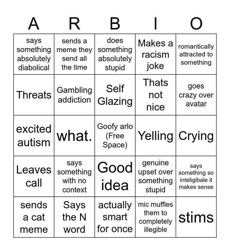 This bingo card has a free space and 43 words: makes a random noise, stims, tweaking out, sends a cat meme, messes up spelling, mic muffles them to completely illegible, does something absolutely stupid, Messes up spelling X3, romantically attracted to something, Says the N word, Makes a racism joke, Yelling, Good idea, says something with no context, Complaining about something, actually smart for once, rage quits, excited autism, sexual joke, goes crazy over avatar, sends a meme they send all the time, tweaks over a meme someone else sends, says something that makes no sense, says something absolutely diabolical, One word response, Crying, Random accent, Yay!, genuine upset over something stupid, Leaves call, Cuts himself off, says something so inteligibale it makes sense, mutes self, what., Speaking another language, Says something that sounds like a inneuendo, Gulp, Self Glazing, Threats, Thats not nice, says they are gonna kill themselves, Gambling addiction and Talking to themselves.