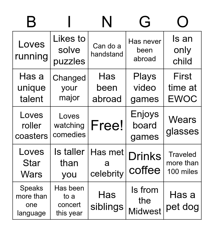 This bingo card has a free space and 34 words: Has a pet cat, Is from the Midwest, Has been to a national park, Has a similar research background, Loves Star Wars, Changed your major, Is an only child, Speaks more than one language, Likes to solve puzzles, Plays a musical instrument, Has been abroad, Can do a handstand, Loved taking Physical Chemistry, Loves to read, Enjoys board games, First time at EWOC, Has been to a concert this year, Loves roller coasters, Is taller than you, Drinks coffee, Has met a celebrity, Has never broken a bone, Loves running, Wears glasses, Has siblings, Has a pet dog, Has never been abroad, Has never been stung by a bee, Plays video games, Has a unique talent, Is shorter than you, Loves watching comedies, Traveled more than 100 miles and Loves icebreakers.