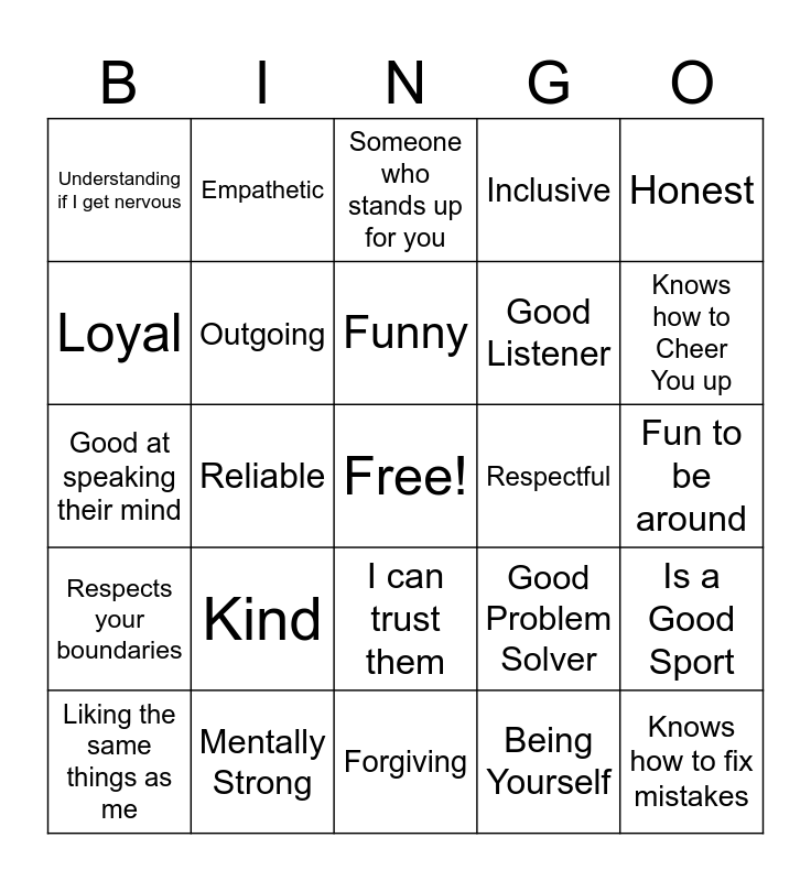 This bingo card has a free space and 24 words: Kind, Mentally Strong, Funny, Liking the same things as me, Honest, Understanding if I get nervous, Loyal, Empathetic, Respectful, I can trust them, Good Listener, Good at speaking their mind, Good Problem Solver, Is a Good Sport, Outgoing, Being Yourself, Fun to be around, Someone who stands up for you, Knows how to Cheer You up, Reliable, Knows how to fix mistakes, Respects your boundaries, Inclusive and Forgiving.