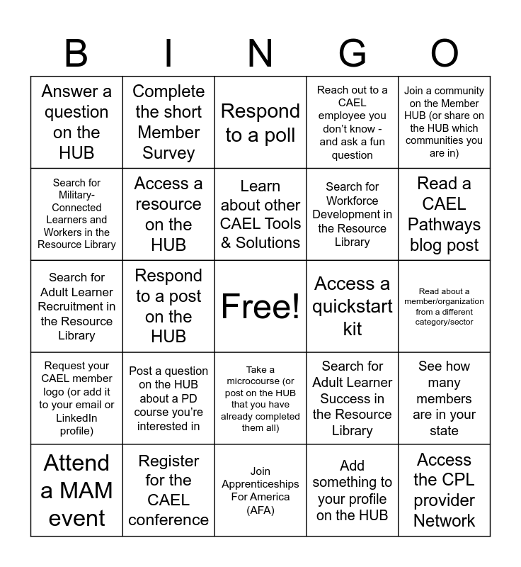 This bingo card has a free space and 29 words: Attend a MAM event, Post on the HUB, Respond to a post on the HUB, Ask a question on the HUB, Answer a question on the HUB, Respond to a poll, Access a resource on the HUB, Post a question on the HUB about a PD course you’re interested in, Access a quickstart kit, Register for the CAEL conference, Read about a member/organization from a different category/sector, Access the CPL provider Network, Join Apprenticeships For America (AFA), Add something to your profile on the HUB, Read a CAEL Pathways blog post, Sign up for a future free event, Take a microcourse (or post on the HUB that you have already completed them all), Request your CAEL member logo (or add it to your email or LinkedIn profile), Join a community on the Member HUB (or share on the HUB which communities you are in), Search for Adult Learner Recruitment in the Resource Library, Search for Adult Learner Success in the Resource Library, Search for Cross-Sector Partnerships in the Resource Library, Search for Workforce Development in the Resource Library, Search for Military-Connected Learners and Workers in the Resource Library, Reach out to a CAEL employee you don’t know - and ask a fun question, Complete the short Member Survey, See how many members are in your state, Learn about other CAEL Tools & Solutions and Use your free CAEL Member Appreciation Month Zoom background.