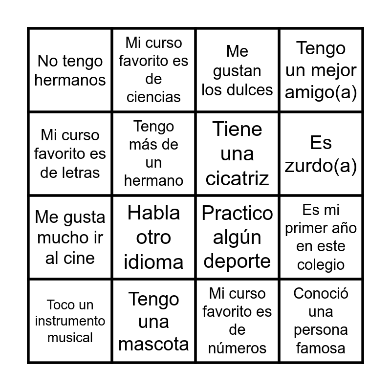 This bingo card has 16 words: Tengo una mascota, Es mi primer año en este colegio, Me gustan los dulces, No tengo hermanos, Me gusta mucho ir al cine, Mi curso favorito es de ciencias, Practico algún deporte, Mi curso favorito es de números, Mi curso favorito es de letras, Tengo más de un hermano, Toco un instrumento musical, Tengo un mejor amigo(a), Habla otro idioma, Es zurdo(a), Tiene una cicatriz and Conoció una persona famosa.