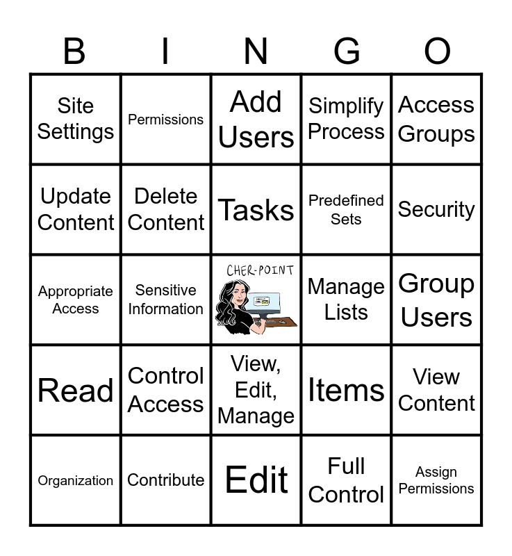 This bingo card has a free space and 25 words: Read, Contribute, Edit, Full Control, Access Groups, Site Settings, Permissions, Add Users, Manage Lists, View Content, Update Content, Delete Content, Libraries, Items, Security, Organization, Sensitive Information, Tasks, Predefined Sets, Group Users, Appropriate Access, Control Access, View, Edit, Manage, Simplify Process and Assign Permissions.