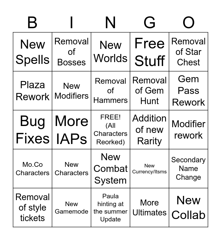 This bingo card has a free space and 24 words: New Characters, New Gamemode, Removal of Hammers, Removal of style tickets, Removal of Star Chest, New Spells, Plaza Rework, Removal of Bosses, Addition of new Rarity, New Combat System, Removal of Gem Hunt, Bug Fixes, New Currency/Itsms, Secondary Name Change, New Modifiers, More Ultimates, Modifier rework, New Worlds, Gem Pass Rework, More IAPs, New Collab, Mo.Co Characters, Free Stuff and Paula hinting at the summer Update.