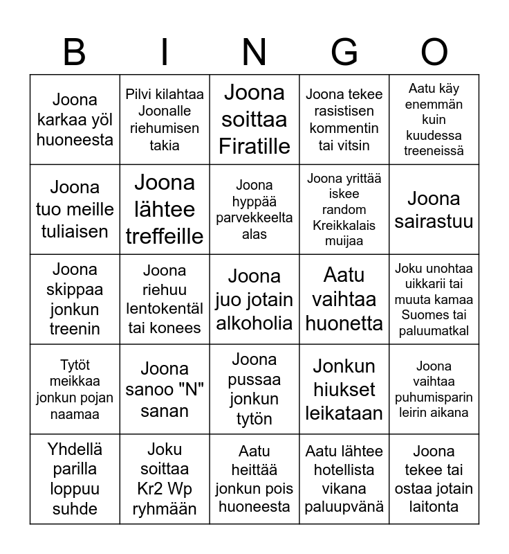 This bingo card has a free space and 24 words: Joona sanoo "N" sanan, Joku soittaa Kr2 Wp ryhmään, Joona hyppää parvekkeelta alas, Yhdellä parilla loppuu suhde, Aatu käy enemmän kuin kuudessa treeneissä, Joona karkaa yöl huoneesta, Joona tuo meille tuliaisen, Pilvi kilahtaa Joonalle riehumisen takia, Aatu vaihtaa huonetta, Joona pussaa jonkun tytön, Joona yrittää iskee random Kreikkalais muijaa, Joona skippaa jonkun treenin, Jonkun hiukset leikataan, Joona vaihtaa puhumisparin leirin aikana, Joona lähtee treffeille, Aatu lähtee hotellista vikana paluupvänä, Joku unohtaa uikkarii tai muuta kamaa Suomes tai paluumatkal, Joona soittaa Firatille, Joona sairastuu, Joona riehuu lentokentäl tai konees, Joona tekee tai ostaa jotain laitonta, Tytöt meikkaa jonkun pojan naamaa, Joona tekee rasistisen kommentin tai vitsin and Aatu heittää jonkun pois huoneesta.